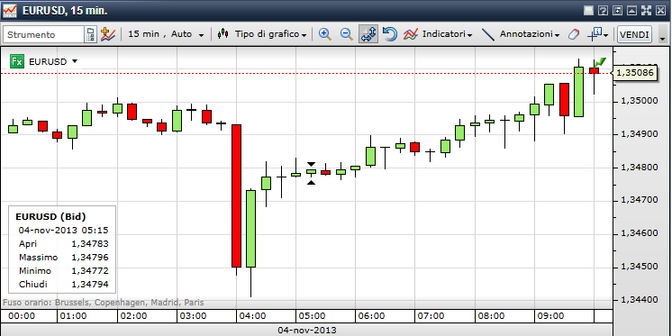 Il grafico EURUSD a 15 minuti mostra che il cambio Euro/Dollaro si attesta a 1.35086