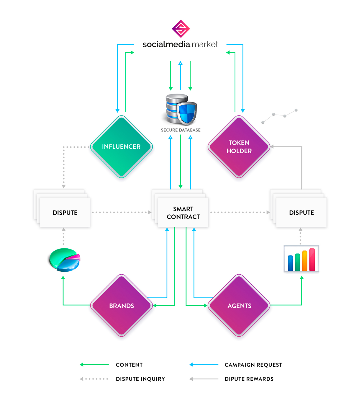 Il nostro token si chiama Social Media Token (SMT). Dà pieno accesso a tutti i servizi, strumenti e funzionalità della nostra piattaforma. Agenzie e grandi inserzionisti che acquistano token scontati durante l’ICO otterranno condizioni più favorevoli per l’acquisto di campagne pubblicitarie e di servizi della piattaforma. I soggetti potranno contare su una remunerazione per la partecipazione al sistema di risoluzione delle controversie decentrato in qualità di arbitri. Inoltre, i token possono essere utilizzati per pagare servizi analitici aggiuntivi, analisi di Big Data o per ottenere informazioni utili sull’interazione e il lavoro con gli influencer.