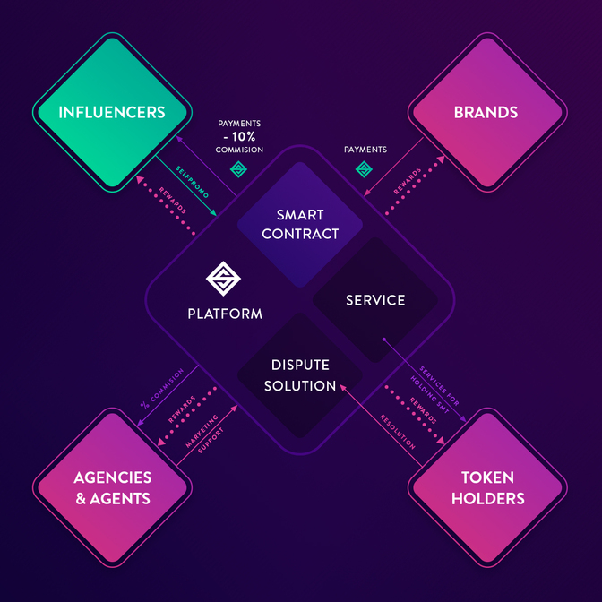 I clienti avranno accesso a blogger famosi su tutti i principali social network, ad un comodo sistema CRM che riduce i rischi e risparmia risorse utili per l’organizzazione, le prestazioni e l’analisi delle campagne pubblicitarie, per non parlare dell’opportunità di effettuare pagamenti internazionali utilizzando i nostri token. Quest’ultima opzione è particolarmente utile per i partner che lavorano in paesi diversi, dove vengono utilizzati diversi sistemi di pagamento. Inoltre, l’introduzione di smart contract e blockchain consentirà di semplificare le partnership, standardizzare il lavoro e garantire accordi reciproci sicuri.