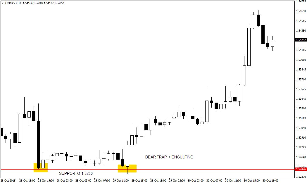 E’ una bear trap, ovvero una trappola per Orsi (venditori). Il pattern grafico viene accompagnato ben presto da un segnale di price action rialzista molto forte, noto come engulfing. Il segnale di inversione del trend rialzista è diventanto ancora più solido, per cui il day-trader può aprire una posizione long con target ambiziosi potendo aspirare anche a mantenere il trade overnight.