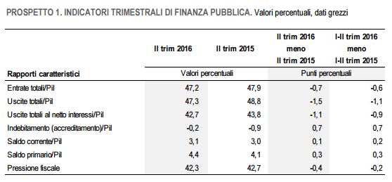 Il saldo primario delle amministrazioni pubbliche (indebitamento al netto degli interessi passivi) nel secondo trimestre del 2016 è risultato positivo per 18.614 milioni di euro (16.707 milioni nell’analogo trimestre 2015), con un’incidenza sul Pil del 4,4% (4,1% nel secondo trimestre dell’anno scorso).