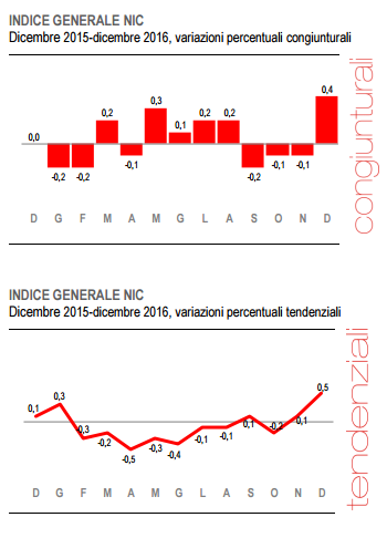 L’indice armonizzato dei prezzi al consumo (IPCA) sale dello 0,4% su base congiunturale e dello 0,5% su quella tendenziale (da +0,1% di novembre). La variazione media annua relativa al 2016 è negativa e pari a -0,1%, (da +0,1% del 2015).
