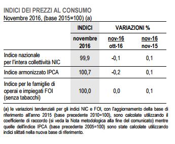 L’Istat ha appena diffuso i dati relativi all’inflazione di novembre. Lo scorso mese, l’indice dei prezzi al consumo - al lordo dei tabacchi - è diminuito dello 0,1% su base mensile ma è aumentato dello 0,1% rispetto a novembre 2015.