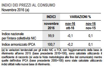 Nel mese di novembre 2016, secondo le stime preliminari Istat, l’inflazione diminuisce dello 0,1% su base mensile e registra un aumento dello 0,1% rispetto a novembre 2015.