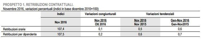 Si tratta dell’incremento più basso dall’inizio delle serie storiche, nel 1982. Complessivamente - osserva l’Istat - nei primi undici mesi del 2016 la retribuzione oraria media è cresciuta dello 0,6% rispetto allo stesso periodo del 2015.