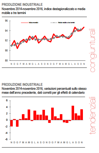 L’Istituto nazionale di statistica spiega che nella media del trimestre settembre-novembre 2016 la produzione è aumentata dello 0,9% rispetto al trimestre precedente.