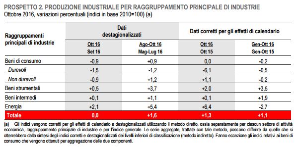 “gli indici corretti per gli effetti di calendario registrano variazioni positive nei comparti dell’energia (+6,4%), dei beni strumentali (+2,0%) e dei beni intermedi (+0,1%). Una variazione nulla segnano invece i beni di consumo (0,0%)”.