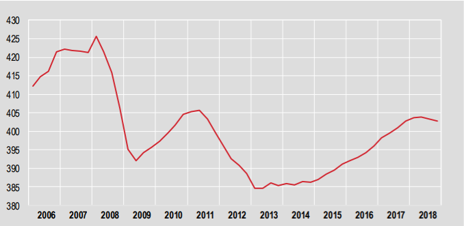 I dati concatenati, destagionalizzati e corretti per gli effetti di calendario (anno di riferimento 2010), sul PIL dell’Italia analizzato dal 1° trimestre 2006 al 4° trimestre 2018. Fonte: Istat