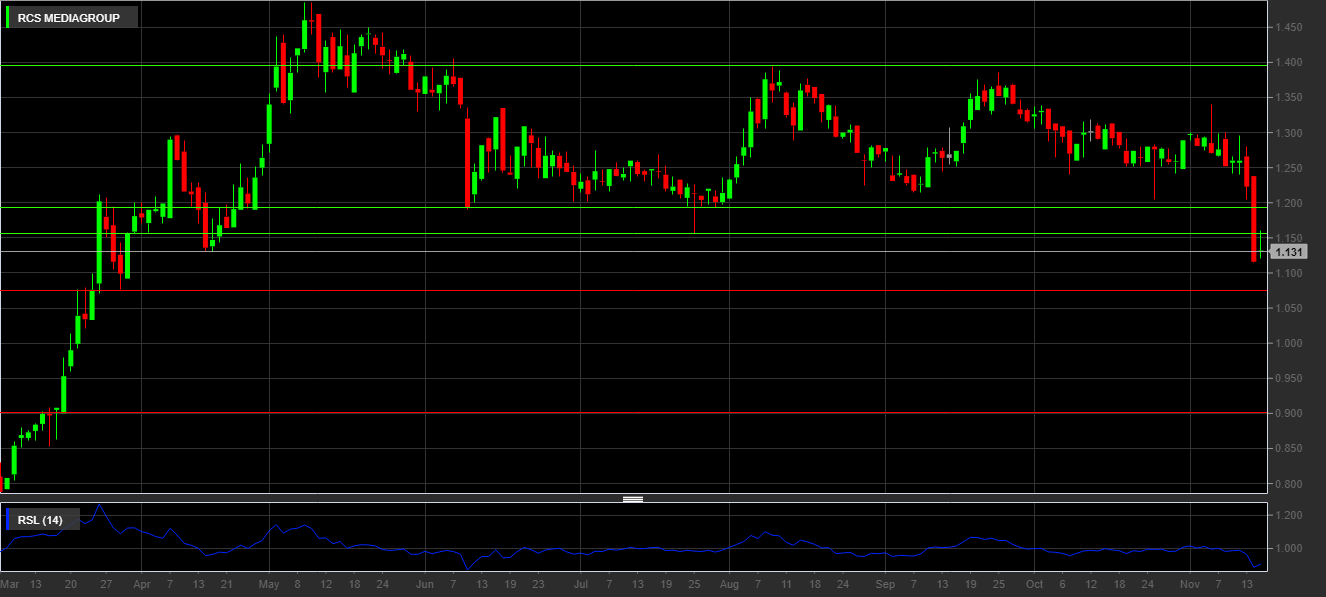 L’arretramento in borsa di RCS è stato molto alto, il valore delle azioni è passato da 1,223€ della chiusura di lunedì 13 novembre a 1,116€ della chiusura del giorno successivo. Nel momento in cui si scrive il prezzo di ogni azione è 1,123€ e segna un leggero rialzo (+0,63%), dovuto a un probabile buy-back, che solitamente avviene dopo corpose vendite.