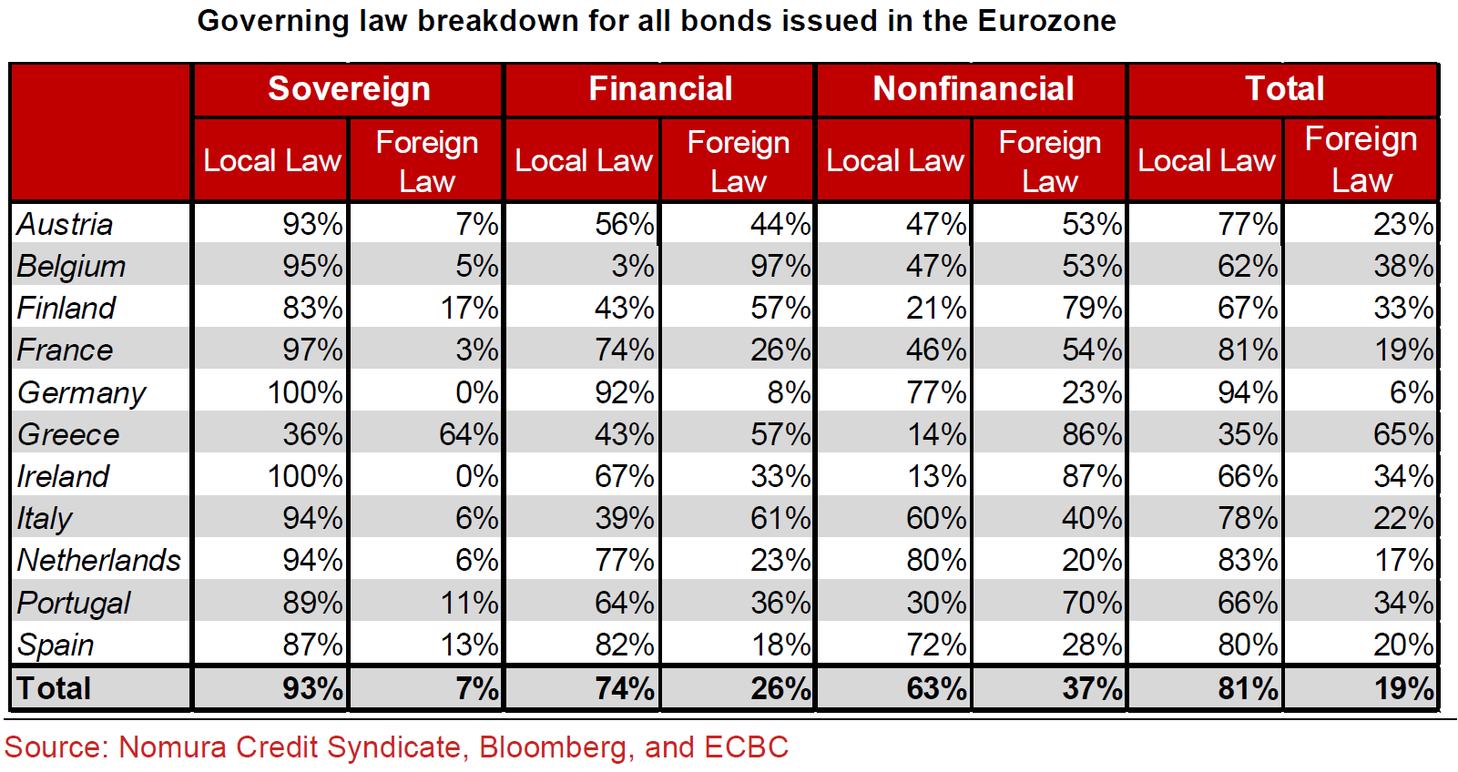 Al tempo infatti quasi tutto il debito pubblico era stato stipulato sotto legislazione italiana. Un problema serio invece esisteva con il debito privato, addirittura in maggioranza stipulato con legislazione estera dalle banche e altri istituti finanziari (financial sector) e per il 40% da imprese e cittadini (non financial sector). [6]
