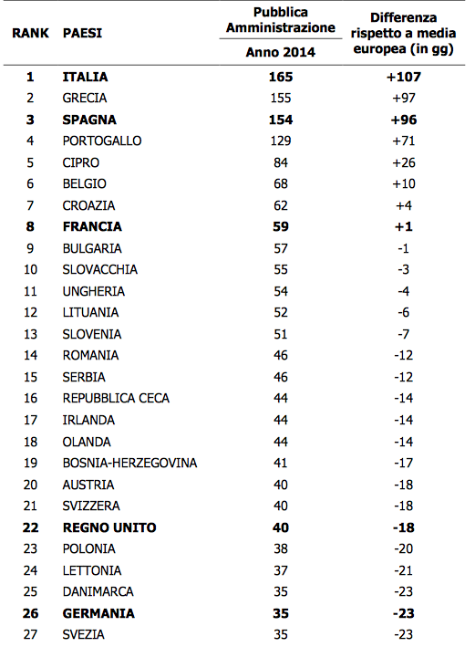 Ecco la classifica degli altri paesi. La Cgia di Mestre indica i giorni necessari per il pagamento delle imprese da parte della pubblica amministrazione e la differenza rispetto alla media europea che si attesta a 58 giorni.