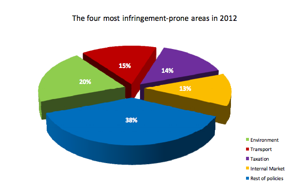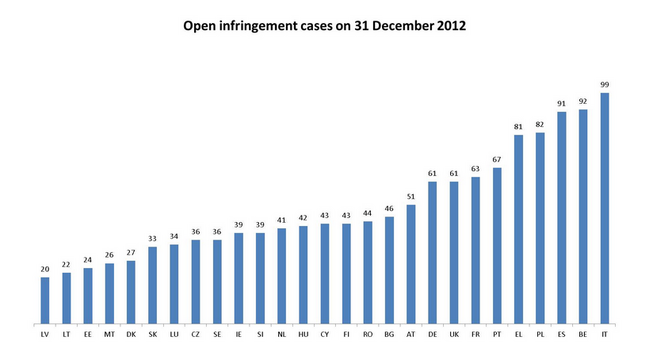 Anzi, notiamo proprio che il paese che ospita il quartier generale dell’Unione Europea è il secondo della lista, con ben 92 procedure di violazione alla fine del 2012.