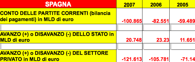 - la Spagna non è andata in crisi né per via del debito pubblico (che fino al 2009 era ampiamente al di sotto del 60 %, limite stabilito dal Trattato di Maastricht) né per via del disavanzo annuale del bilancio dello Stato (addirittura era in surplus per cui questo “problema” proprio non l’aveva);