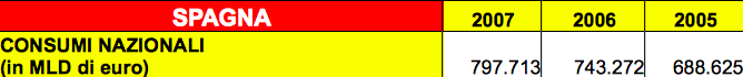Vedendo i dati spagnoli è evidente che la Spagna “importa” più di quanto “esporta” e dal 2005 al 2007 questo “status” di IMPORTATORE NETTO si è rafforzato; si parla ovviamente di importi consistenti visto che sono espressi in miliardi di euro.