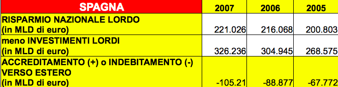 Tornando ai dati della Spagna, abbiamo pertanto visto che dal 2005 al 2007, quello che stava aumentando, ogni anno, per importi consistenti (67,772 MLD di euro nel 2005, altri 88,877 MLD nel 2006 ed ulteriori 105,21 MLD nel 2007) era il debito estero ma nessuno all’epoca (e neppure oggi) ne parlava.