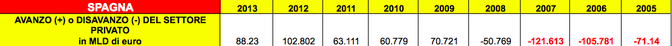- le nuove TLTRO promosse da Mario Draghi, al di là degli annunci, non serviranno a far prestare alle banche spagnole ulteriore liquidità alle loro aziende; è evidente che il settore privato spagnolo, dal 2009 ha cominciato ogni anno a chiudere in avanzo; avete appena capito che ciò significa che i risparmi generati nei vari anni dal settore privato sono superiori rispetto a quanto viene investito: liquidità ce n’è già a volontà e le banche non prestano solo perché hanno timore di prestare visto quanto sta succedendo in Spagna (e come dar loro torto);