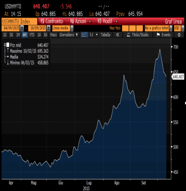 Lo spread sul rendimento tra i bond HY denominati in dollari USA e la curva swap USD è salito dai minimi di giugno a 465 bp ai massimi recenti di 645 bp, come è possibile vedere dal database di Bloomberg qui di seguito.