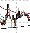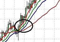 Usando l’MT4, possono essere sistemate tre medie mobili sul grafico. I parametri sono: regolare, applicato al prezzo medio (Alto+Basso/2), periodo di tre (rosso), sei (verde), nove (blu).