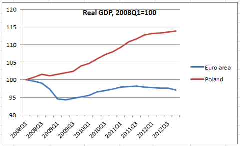 La curva del PIL polacco è in crescita, nonostante i recenti vacillamenti, dovuti principalmente all’austerity fiscale e alla decisione di alzare i tassi di interesse nel 2011, "nel tentativo di emulare la BCE", scrive l’economista.
