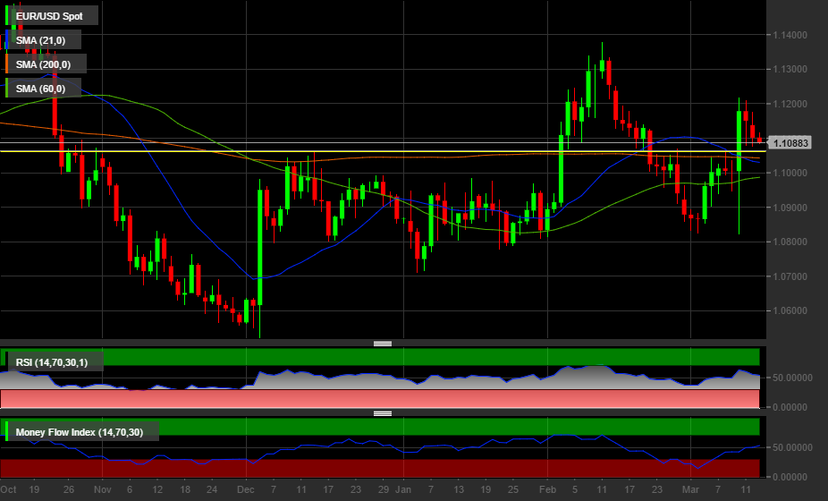 Poco mosso il cambio Euro-Dollaro prima dell’avvio delle Borse europee. Il cross sta scambiando poco sotto la parità a quota 1,1096$ in attesa delle decisioni della Federal Reserve. Ieri l’EurUsd ha proseguito la corsa a ribasso iniziata venerdì dopo aver digerito le parole in conferenza stampa del presidente della BCE Mario Draghi.