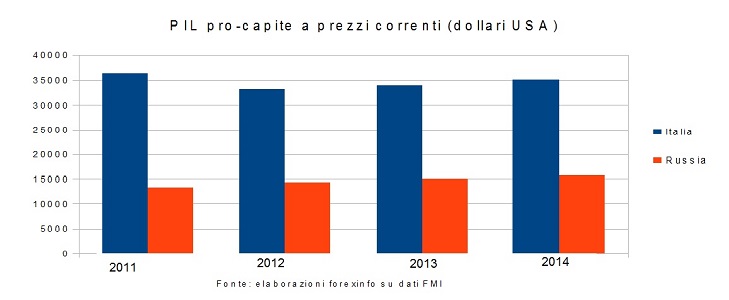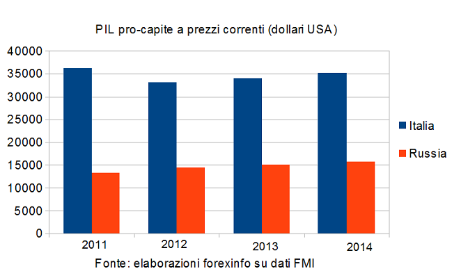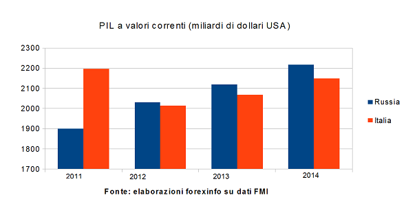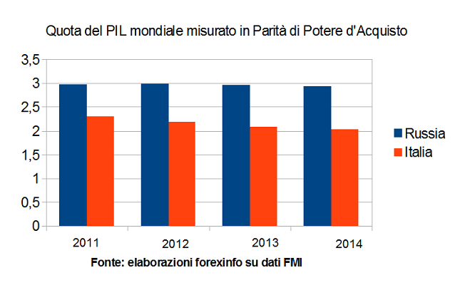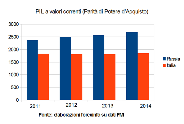 Nella figura qui sopra abbiamo riportato il valore del PIL nominale, ossia a prezzi correnti, espresso in dollari americani per l’Italia e la Russia. E’ possibile vedere come l’ex Unione Sovietica avesse superato in termini di Pil il nostro paese già nel 2012, con le stime per il 2013 e 2014 che confermano questa tendenza.
