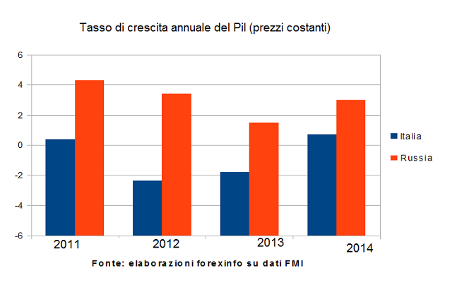 I dati sul PIL pro-capite riportati qui sopra affermano invece tutto il contrario. La performance italiana è nettamente migliore di quella russa già a partire dal 2011, con le previsioni per il 2013 e il 2014 che confermano l’andamento.