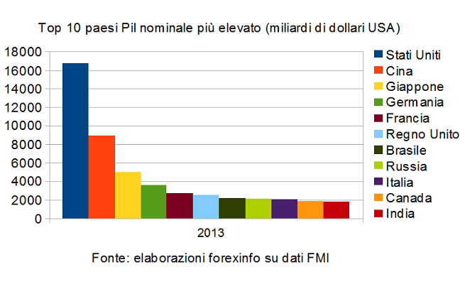 Andando a guardare un po’ di dati del World Economic Outlook possiamo trarre alcune conclusioni. Tanto per cominciare, se proprio vogliamo parlare di top 10, la Russia era già sopra di noi nel 2012,senza bisogno di fare previsioni per il 2014. Riportiamo qui sotto il grafico per il 2013 (ovviamente si tratta di previsioni). Ci sono anche il Brasile, la Cina e l’India, le cui performance economiche sono note a tutti e che inspiegabilmente non fanno parte del G8 (che comprende Stati Uniti, Giappone, Germania, Francia, Regno Unito, Italia, Canada, e dal 1998 la Russia).
