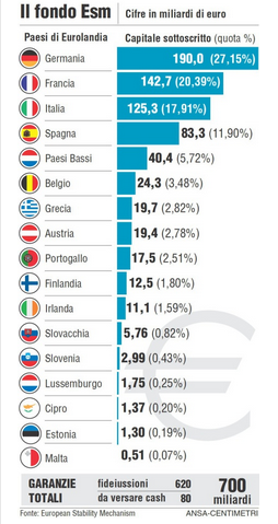 L’ESM (European Stability Mechanism) altresì chiamato Fondo Salva Stati, istituito dalle modifiche al Trattato di Lisbona e approvato nel 2011 dal Parlamento e dal Consiglio europei prevede l’obbligo, per tutti i Paesi aderenti al MES (o ESM che dir si voglia) di versare al suddetto una quota che viene stabilita in base al peso economico delle singole nazioni.