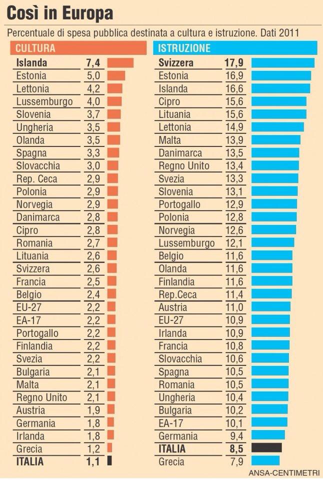 L’Italia si trova all’ultimo posto in quanto a percentuale di spesa pubblica destinata alla cultura (1,1% a fronte del 2,2% della media continentale) e al penultimo, seguita solo dalla Grecia, per quanto riguarda i soldi volti a finanziare l’istruzione (8,5% a fronte del 10,9% di media dell’UE a 27).