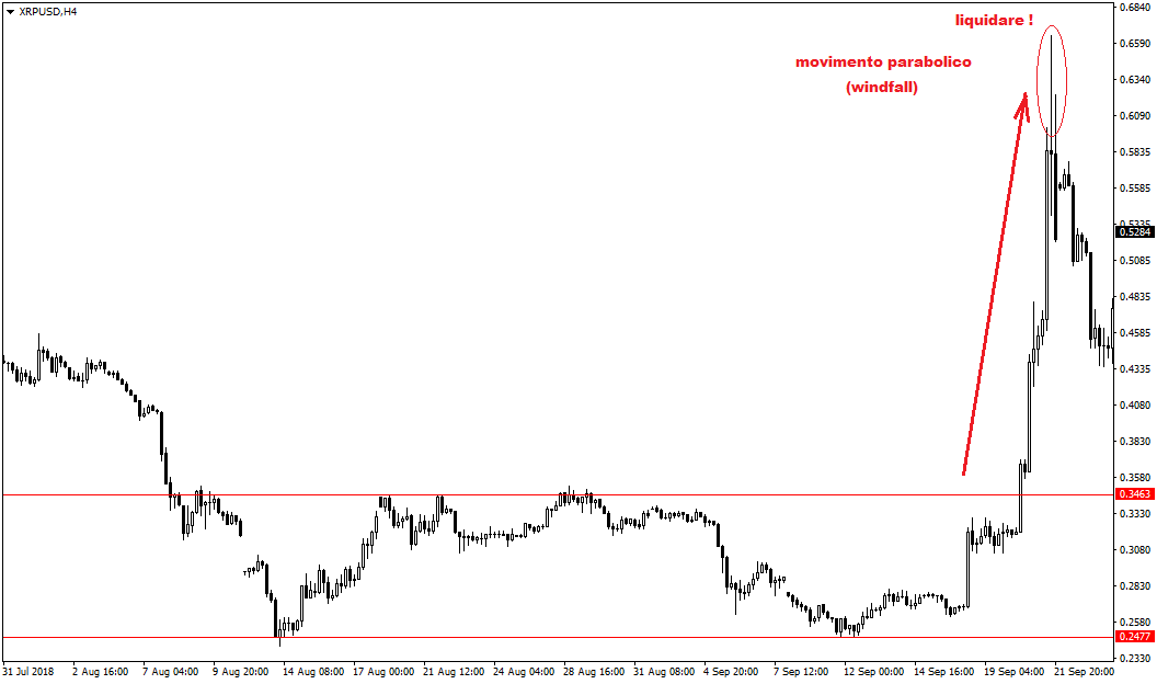 E’ il caso, ad esempio, di Ripple (XRP/USD), una delle criptovalute più note al mondo. Se si osserva il grafico a 4 ore in basso, si può notare un rally da urlo a seguito del breakout deciso della congestione. Nel giro di poche ore la quotazione di Ripple passerà da 0,35 a 0,66, offrendo ai trader di breve periodo che avevano comprato il breakout un guadagno inatteso. A questo punto si pone il problema di come uscire correttamente dal trade, nel caso in cui i prezzi evidenzino movimenti così spettacolari.