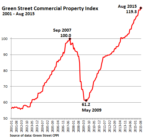 Wall Street è solo un esempio, si può anche vedere il grafico dell’andamento dei prezzi degli immobili commerciali che è completamente slegato dall’andamento degli utili societari: