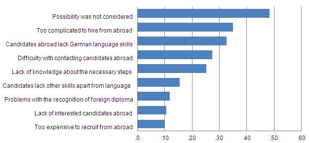 Nel grafico qui sotto, vediamo le ragioni principali della difficoltà di reclutamento di personale dall’estero per la Germania: