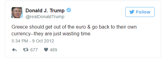 Trump non ha perso l’occasione per esprimere la sua posizione e per far sapere al mondo la sua opinione: la Grecia deve lasciare la moneta unica. Il debito sta infatti schiacciando il Paese e non si riesce ad uscire dalla crisi, l’unico modo sembra quindi quello di lasciare l’Euro e tornare alla moneta nazionale.