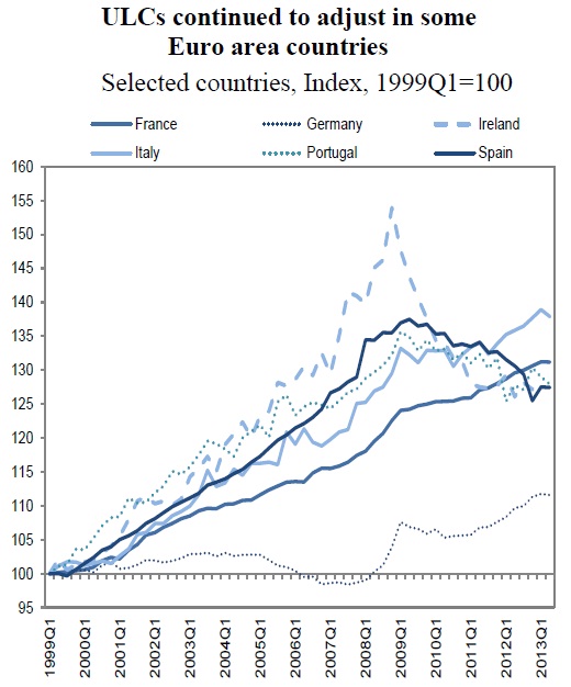 Sembrano esserci, in realtà, buone ragioni per sospettare che la caduta nei livelli del costo del lavoro per unità di prodotto nei paesi più a rischio dell’area Euro (Grecia, Irlanda, Portogallo e Spagna) sia stata sovrastimata. In parte anche perchè tale caduta rifletterebbe cadute nei livelli occupazionali invece di rispecchiare un reale e profondo incremento nella capacità, da parte di questi paesi, di produrre beni e servizi.