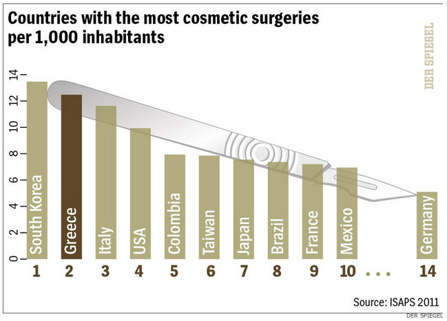 È un paradosso, scrive il giornale, in un paese dove oltre il 35% della popolazione non possiede nemmeno un’assicurazione sanitaria. La Grecia sta stabilendo moltissimi record preoccupanti quando si parla di debito pubblico, disoccupazione e fallimenti aziendali. Ma questi dati della nternational Society of Aethetic Plastic Surgery (ISAPS) mostrano una facciata diversa, insolita: da nessun’altra parte in Europa vengono effettuati tanti interventi di chirurgia estetica.