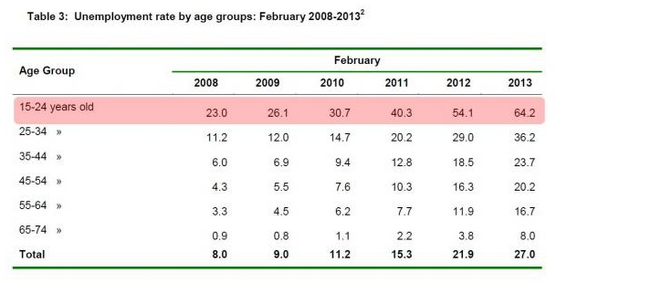 Nel sesto anno consecutivo di recessione economica, aggravata dall’austerity e dalle imposizioni per i bailout, la disoccupazione giovanile arriva al 64.2% e le stime sul Pil inaspriscono la contrazione (-4.2% nel 2013 secondo il FMI).