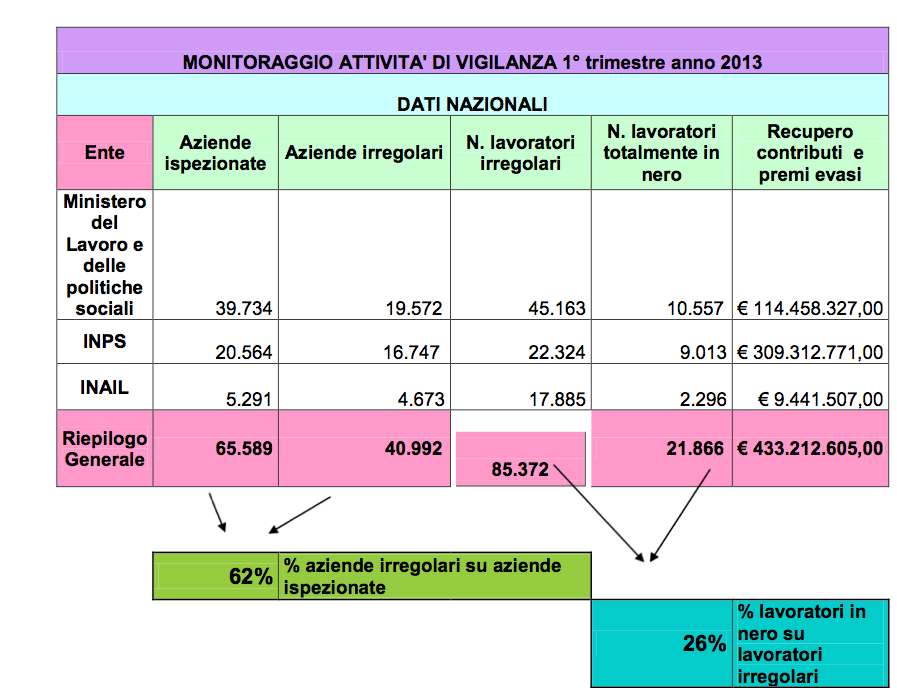 per il raggiungimento degli obiettivi per l’anno 2013, circa 240mila ispezioni concentrate verso forme di irregolarità nella gestione dei rapporti di lavoro