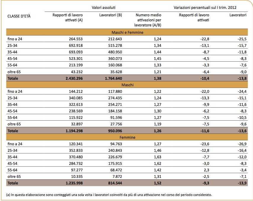 Un accenno merita anche la distinzione delle nuove assunzioni in base all’età del lavoratore: la maggior parte dei lavoratori assunti nel 2013 ha un’età compresa tra 25 e 34 anni; sono 480.950 i soggetti appartenenti alla classe d’età tra i 35 e i 44 anni.