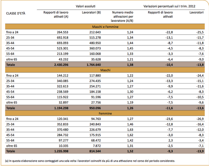 Nel primo trimestre del 2013 si registra anche una diminuzione dei rapporti di lavoro cessati: 1.901.830, 4,2% in meno rispetto al 2012. Oltre la metà di questi rapporti di lavoro finiti hanno riguardato le donne e i settori meno interessati sono stati l’industria e le costruzioni.
