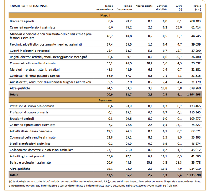 La tipologia di contratto più utilizzata, che copre il 62,7% del totale è a tempo determinato soprattutto per quanto riguarda braccianti agricoli e camerieri. Il tipo di contrattualizzazione a tempo indeterminato invece, riguarda maggiormente manovali e personale non qualificato dell’edilizia civile e professioni assimilate, muratori in pietra, mattoni, refrattari, per gli autisti di taxi, conduttori di automobili, furgoni e altri veicoli.