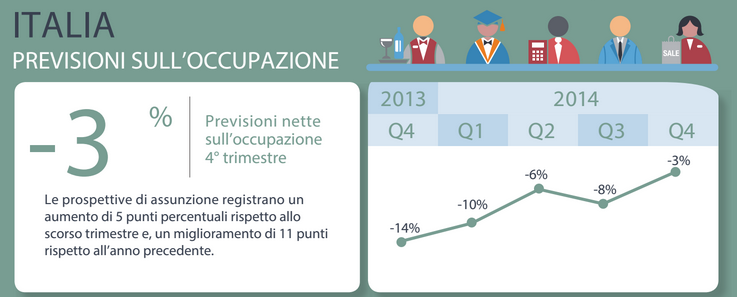 L’indagine è stata condotta su un campione rappresentativo di 1.001 datori di lavoro italiani che riferiscono intenzioni di assunzione ancora pessimistiche ma in leggero miglioramento, per il quarto trimestre 2014. Il 4% di loro si aspetta di incrementare il proprio organico, il 10% prevede invece un calo nelle assunzioni, mentre per il 78% non vi sarà alcuna variazione.