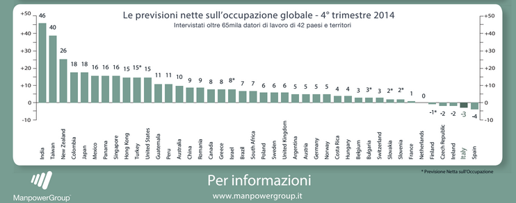 “Malgrado tutti i principali indicatori economici rimangono negativi per l’Italia”, ha dichiarato Stefano Scabbio, Presidente e CEO di ManpowerGroup Italy e Iberia, “le previsioni ci mostrano più ottimismo rispetto al passato. I prossimi mesi saranno fondamentali per far uscire l’Italia dalla palude e una nuova riforma del lavoro può creare ottime opportunità di crescita. L’attenzione deve essere però posta su un incremento della flessibilità e sulla creazione di nuovi posti di lavoro soprattutto per i giovani. Inoltre, Expo Milano 2015, di cui ManpowerGroup è Official HR Premium Partner, deve essere un’ulteriore e importante occasione da sfruttare per il rilancio del Paese.”