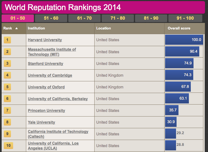 Rispetto alle classifiche ufficiali delle università migliori del mondo, il World Reputation Rankings qui illustrato si basa su opinioni soggettive anche se, specificano sul sito del Times Higher Education, "di riconosciuti e apprezzati accademici".