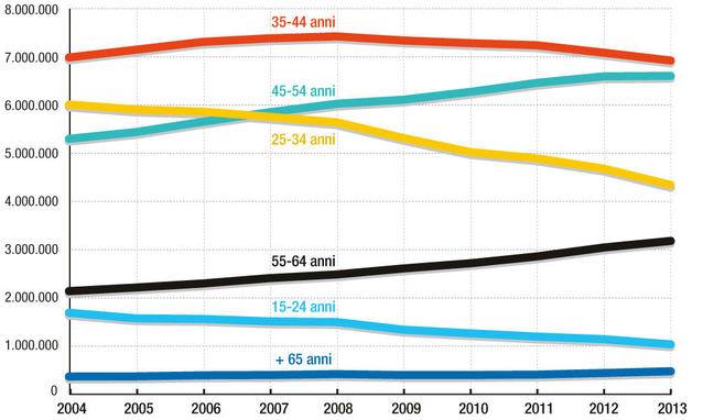 Diamo uno sguardo ai numeri per capire meglio l’entità del fenomeno. Facendo un confronto tra il periodo precedente alla crisi finanziaria (gennaio 2007-agosto 2008) e quello attuale (gennaio 2012-agosto 2013) risulta che le assunzioni degli over 50 sono cresciute del 172%, in particolare: