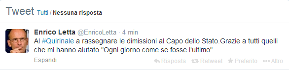 Il Presidente della Repubblica, Giorgio Napolitano, ha ricevuto oggi al Quirinale il Presidente del Consiglio dei Ministri onorevole Enrico Letta - accompagnato dal Sottosegretario di Stato alla Presidenza del Consiglio, Filippo Patroni Griffi - che gli ha rassegnato le dimissioni, irrevocabili, dell’esecutivo da lui presieduto.