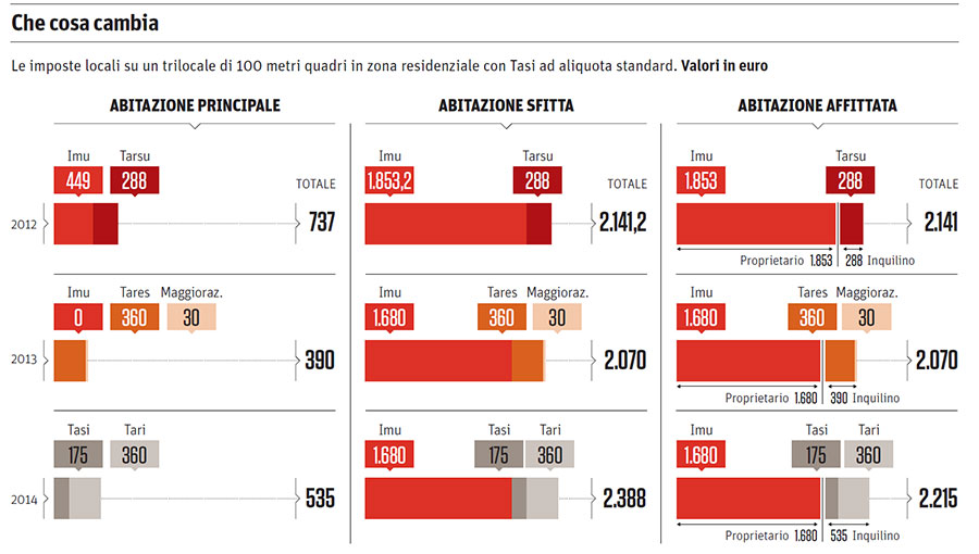 - sull’abitazione principale, al posto di IMU e TARES, verrà applicato il Trise, tributo composto da Tari (rifiuti), calcolata in base ai metri quadrati o alla quantità di rifiuti e quindi pagata da chi occupa l’immobile, e Tasi (servizi indivisibili), tributo calcolato sul valore catastale. Per la parte riferita ai servizi indivisibili, per il 2014 l’aliquota