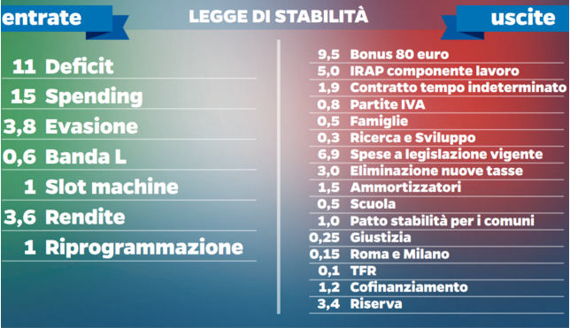 Se guardiamo la colonna di destra (quella delle “uscite”) leggiamo tutta una serie di provvedimenti che non possono che far piacere agli italiani (bonus di 80 euro, riduzione dell’Irap, ecc.) senza apparentemente che vi sia un aggravio delle imposte e tasse per la comune gente onesta (cfr colonna di sinistra dove tra le entrate troviamo 11 miliardi di deficit, 15 miliardi di generica “spending”, 3,8 miliardi di lotta all’evasione, ecc.).