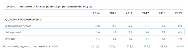 Se l’indebitamento netto è - 2,2 % del pil e gli interessi sono il 4,3 % del pil, il saldo primario deve essere 2,1 % e non 2,0 %.