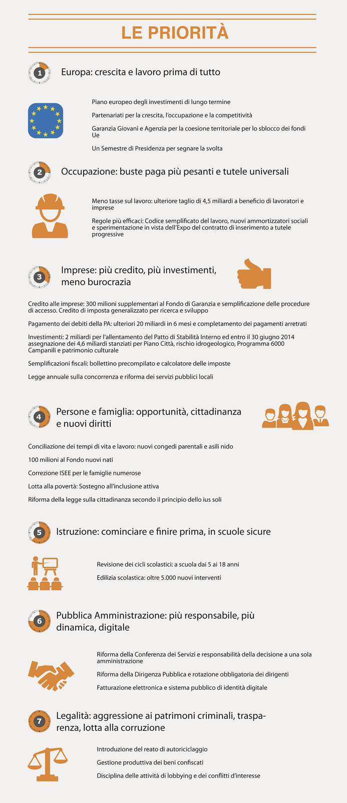 Nel documento si legge altresì che per le altre priorità di “Impegno Italia” saranno disponibili 4,5 miliardi nel 2014 e 9 miliardi nel 2015.