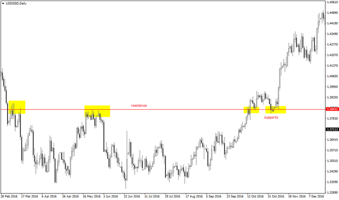 Un segnale operativo nella “terra di nessuno” spesso si rivela infruttuoso, mentre un segnale apparso su una zona chiave del mercato ha maggiori possibilità di offrire spunti vincenti. Per capire quanto siano importanti questi livelli per gli operatori finanziari andiamo ad esaminare un grafico del forex market, precisamente il daily chart del tasso di cambio USD/SGD, ovvero dollaro americano su dollaro di Singapore.